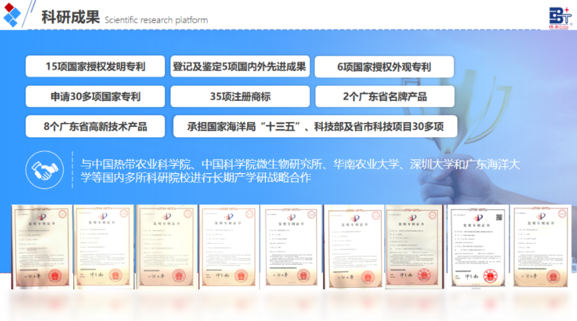 截至目前,公司累計(jì)承擔(dān)國(guó)家重點(diǎn)研發(fā)計(jì)劃 “藍(lán)色糧倉(cāng)” 專(zhuān)項(xiàng)、國(guó)家海洋局 “十三五” 專(zhuān)項(xiàng)等國(guó)家及省市科研項(xiàng)目 30 余項(xiàng),獲授權(quán)國(guó)家專(zhuān)利 30 余項(xiàng)(其中發(fā)明專(zhuān)利 17 項(xiàng)) ,主導(dǎo)制定 3 項(xiàng)團(tuán)體標(biāo)準(zhǔn),擁有肥料登記證近 20 個(gè),產(chǎn)品通過(guò)有機(jī)認(rèn)證、綠色認(rèn)證,并獲評(píng) “國(guó)家重點(diǎn)新產(chǎn)品”“廣東省知名品牌”。